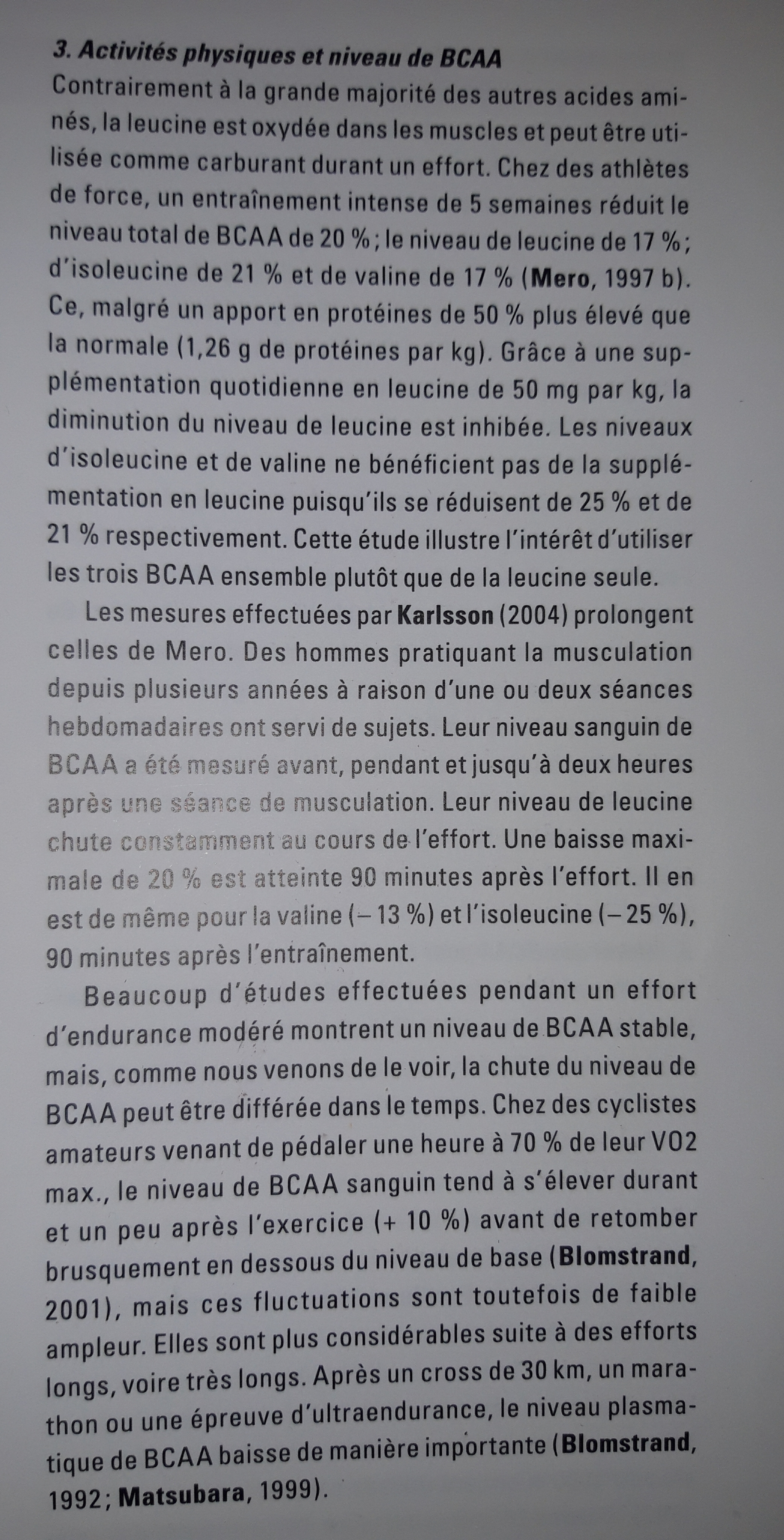 Mais alors comment compenser la perte importante de bcaa induite par un entraînement de musculation intense ? Dans le "guide des compléments alimentaires pour sportifs" ils mettent çà en avant soutenue par des études mais la consommation de protéines est largement inférieure à la mienne, ils parlent de 1g3 de protéines par jour.